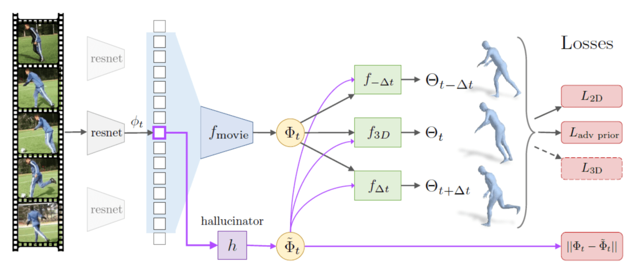 우선, 입력 데이터는 ResNet에 의해 학습이 이루어지며 특징량 φ를 출력합니다. 다음으로, 특징량 φ를 f (movie)에 입력하면 사람의 실제 움직임을 표현하는 특징량인 Φ를 출력합니다. 마지막으로, 특징량 Φ를 f (t-Δt) , f (3D) , f (t + Δt)에 입력하면 과거, 현재, 미래 일련의 3차원 메쉬 구성에 필요한 파라미터인 Θ (t-Δt) , Θ (t) , Θ (t + Δt)를 출력합니다. 또한 hallucinator에 의해 사람의 움직임을 표현하는 특징량을 생성하고 실제 특징량인 Φ와 비교합니다.