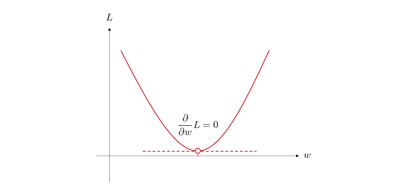 목적 함수의 값이 최소가 되는 점을 구할 때, 미분 지식이 유용합니다. 미분은, 대상으로 하는 함수의 접선 기울기를 구할 수 있습니다. 볼록 함수는 접선의 기울기가 0인 점에서 함수의 최솟값 또는 최대 값을 얻을 수 있습니다. 목적 함수가 x에 대한 이차 함수이기 때문에 아래 그림과 같이 무게 w에 대한 접선의 기울기가 0일 때, 목적 함수의 값이 최소가 됩니다.