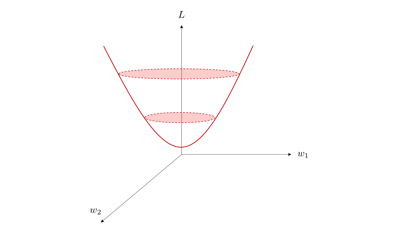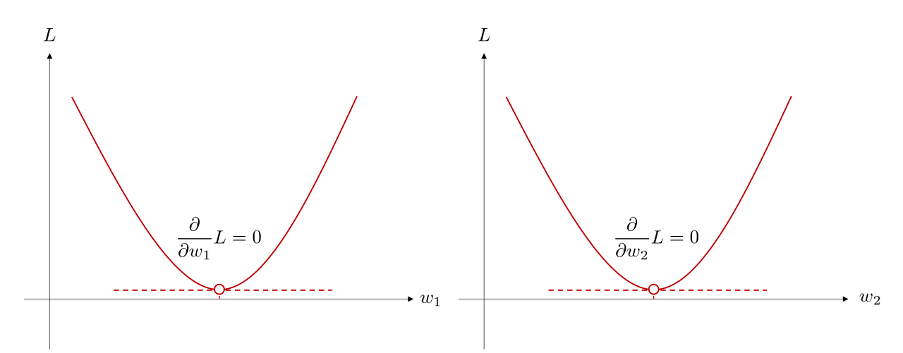 목적 함수 L을 w1의 이차 함수, w2의 이차 함수로 보았을 때, L은 아래 그림과 같이 됩니다.
