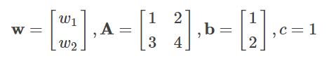 그럼, 목적 함수를 최소화하는 매개 변수 w를 구하는 방법을 생각해 보겠습니다. 목적 함수는 매개 변수 w에 대한 이차 함수로 되어 있습니다. 우선 w 이외의 벡터나 행렬에 구체적인 수치를 적용시켜 생각해 봅시다. 예를 들어,