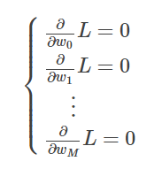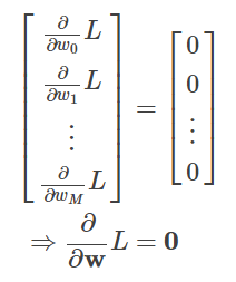 여기에서는 두 개의 매개 변수 w1과 w2에 대하여 그려 보이고 있지만, 목적 함수가 임의의 M개 변수 w0, w1, w2,…, wM에 의해 특징지어지는 경우에도, 목적 함수가 각각의 매개 변수에 대한 이차 형식으로 되어있는 한, 같은 모양이라고 할 수 있습니다. 즉 M+1개의 연립 방정식,
