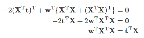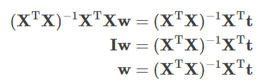 로 정리됩니다. 특히, 이 마지막 표현식을 정규 방정식(normal equation)이라고 합니다. 위 식은 주어진 데이터를 정렬한 디자인 행렬 X와, 각 데이터의 목표치를 늘어놓은 벡터 t로부터 최적의 매개 변수 w를 계산하고 있습니다. I(아이)는 단위행렬을 나타냅니다.