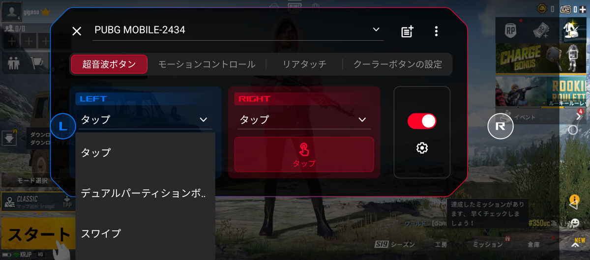 Kunai 3와 AeroActive Cooler 5의 각종 버튼은 "키 매핑"항목에서 설정할 수 있습니다. 키 매핑은 Kunai 3 등을 연결한 상태에서 버튼을 누르면 버튼에 해당하는 아이콘이 출현하며, 아이콘을 화면의 조작 키로 드래그해서 붙이면 버튼과 터치 조작을 연동시킬 수 있게 되는 구조입니다.