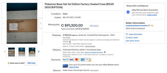 10일간의 입찰 기간을 마치고 최종적으로 상품은 7만 2,500달러(약 8,600만 원)의 최고 입찰액이 붙었습니다만, 그 후 number1pokemonmaster와 매수자가 모두 거래를 캔슬했습니다. PokéBeach는 “본래라면 43만 달러(약 5억)의 가치가 있고, 이것이 6개 케이스 들어 있다는 것이므로, 최소 260만 달러(약 30억)의 값이 붙어있어도 이상하지 않았습니다. 그러나 사람들이 수상하게 생각했기 때문에 평소보다 훨씬 싼 값이 붙었을 것입니다."라고 분석하고 있습니다.