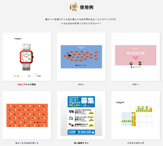요거는 도트만 보고는 무엇을 나타내고 있는지 알기 어렵네요. 거친 도트에서는 대상을 "궁극적으로 추상화"하고 있기 때문에, 다른 디자인과 조합하여 이용하는 것이 좋을 것 같습니다. DOTOWN의 사용 예 페이지에서는 거친 도트를 복수 조합해 아날로그시계나 배너를 작성한 예가 공개되어 있으므로, 사용에 참고가 될 것 같습니다.
