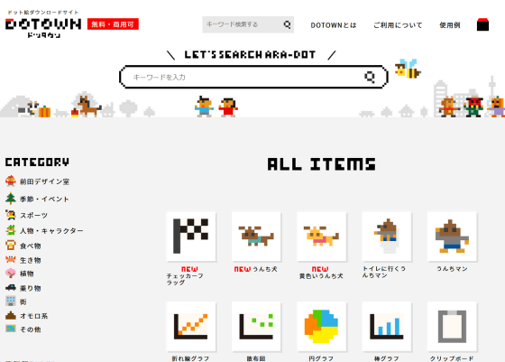 발표 자료나 웹페이지를 작성하다 보면 포인트를 줄 수 있는 이미지를 넣고 싶은 상황이 자주 발생합니다. 이에 상용으로도 이용 가능한 도트 그림을 무료로 배포하고 있는 웹사이트 「DOTOWN」을 발견했기 때문에, 실제로 어떤 도트 그림들이 있는지 확인해 보았습니다.