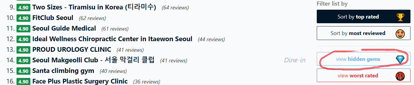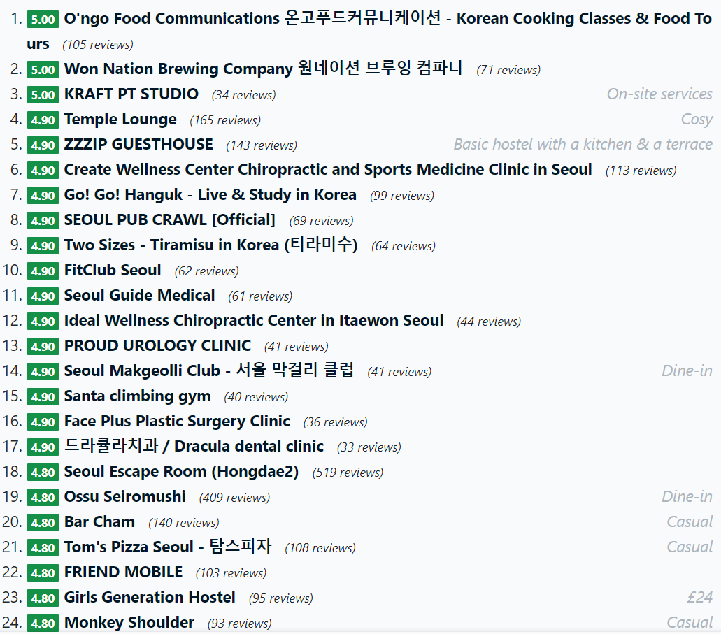 리뷰수가 많은 곳보다는 5점 만점인 장소가 랭킹이 높습니다.