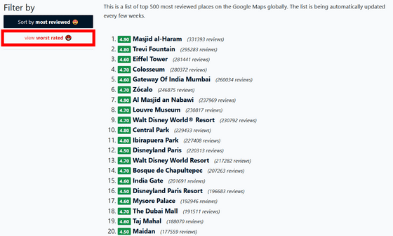 이 사이트는 「평가가 나쁜 장소 랭킹」도 확인할 수 있습니다. 확인하려면 "view worst rated"를 클릭하십시오.