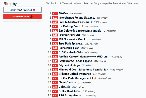 그러면 나쁜 리뷰가 많은 순서로 순위가 정렬됩니다. 여기서는 50건 이상의 리뷰가 있었던 곳만 픽업되었습니다. 당당한 1위에 빛난 것은 독일 밤베르크(Bamberg)에 있는 Fit/One이라는 스포츠 체육관. Top-Rated.online이 집계한 리뷰 76개가 별 1(최저)로 평가되었습니다.