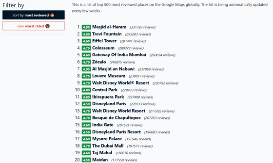 Google 지도에 게재된 각 시설은 일반 사용자로부터 '리뷰'를 받을 수 있습니다. 그런 Google 지도의 리뷰를 집계해, 랭킹 형식으로 정리한 사이트 「Top-Rated.online」이 공개되었으므로 확인해 보았습니다.