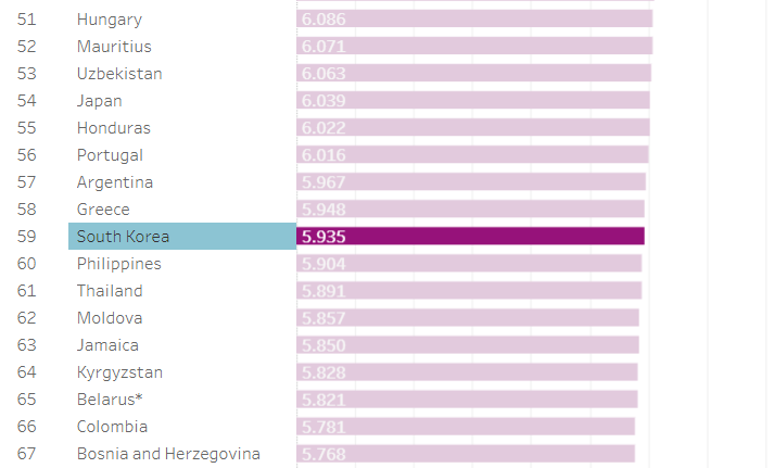 한국은 총 146개국 중에서 59위에 머물고 있네요...