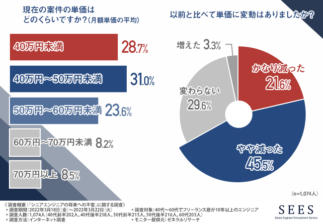「현재의 단가는 얼마인가(월액 단가의 평균)」라는 질문에는, 「40~50만 엔 미만」이 31.0%로 가장 많았고, 다음으로 「40만 엔 미만」이 28.7%, 「50~ 60만 엔 미만이 23.6%이었습니다.