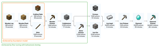 마인크래프트는 돌이나 철 등을 수집하여 아이템을 제작할 수 있습니다. 다이아몬드제 아이템을 만들 때에는 「다이아몬드 광석을 채굴하기 위한 아이템을 크래프트」, 「다이아몬드 광석을 찾아 지하 깊숙이 팔 것」 등의 조작이 필요해, 숙련된 플레이어도 초기 상태에서 다이아몬드제 아이템을 만들기까지 몇 시간이 걸립니다. OpenAI는 인터넷에 존재하는 방대한 수의 마인크래프트 플레이 무비를 AI에게 학습시켜, 단 10분 만에 다이아몬드제 아이템을 크래프트 할 수 있도록 개발했습니다.