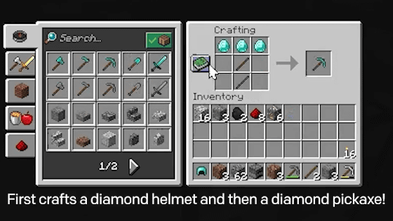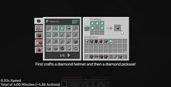 그 후, 최초에 학습시켰던 라벨 붙인 데이터의 재조정을 실시하여 AI의 동작을 최적화해, 다이아몬드제 아이템 제작에 필요한 「철제 곡괭이 만들기」, 「다이아몬드 광석의 발견」 등의 태스크에 보상을 설정해 AI 학습을 진행시켰습니다.