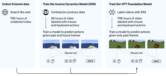AI 학습에는 VPT라고 불리는 기술이 사용되었습니다. 일반적으로 AI 학습에는 인간이 수동으로 라벨을 붙인 대량의 데이터가 사용됩니다. 그러나 이번에는 [어떤 키가 눌렀는가], [마우스를 어떻게 움직였는가] 등의 라벨이 붙은 비교적 단시간의 마인크래프트 플레이 무비를 준비해 AI에 학습시켜 [키, 마우스와 플레이 무비의 대응]을 학습시킨 뒤 라벨을 부여하지 않은 방대한 수의 플레이 무비를 학습시켰습니다.