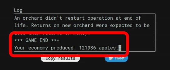 게임 개시로부터 240개월이 경과되면 게임이 오버되며 그때까지 생산한 총 사과 수가 표시됩니다.