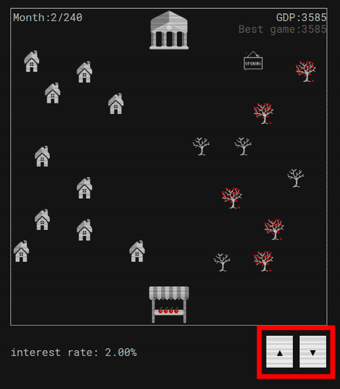 플레이어가 조작 가능한 것은 오로지 금리의 인상과 인하뿐입니다. 금리를 지정하여 사과의 유통을 관리하고 일정 기간이 경과할 때까지 오로지 GDP(사과의 총 생산수)를 올려 나갑니다.