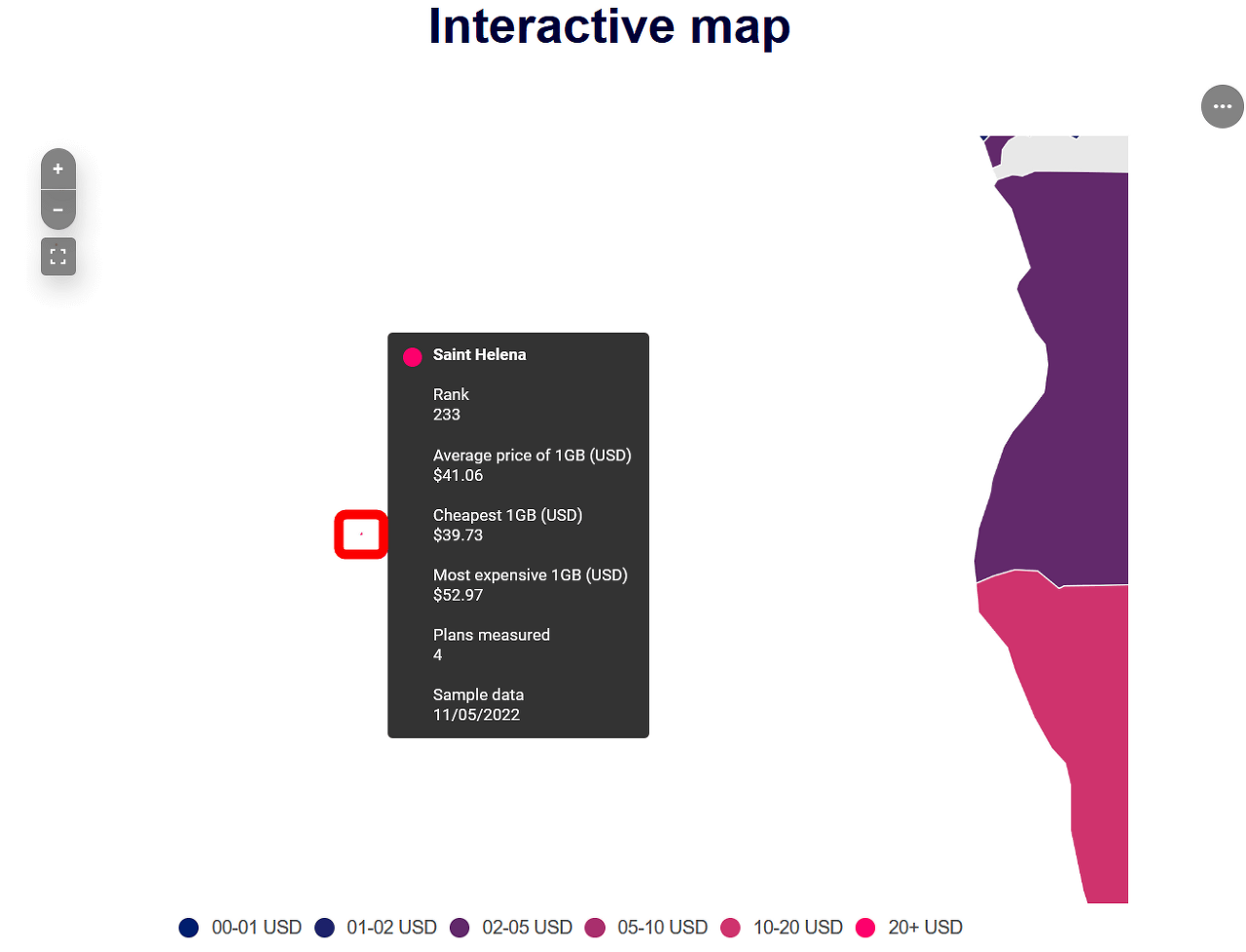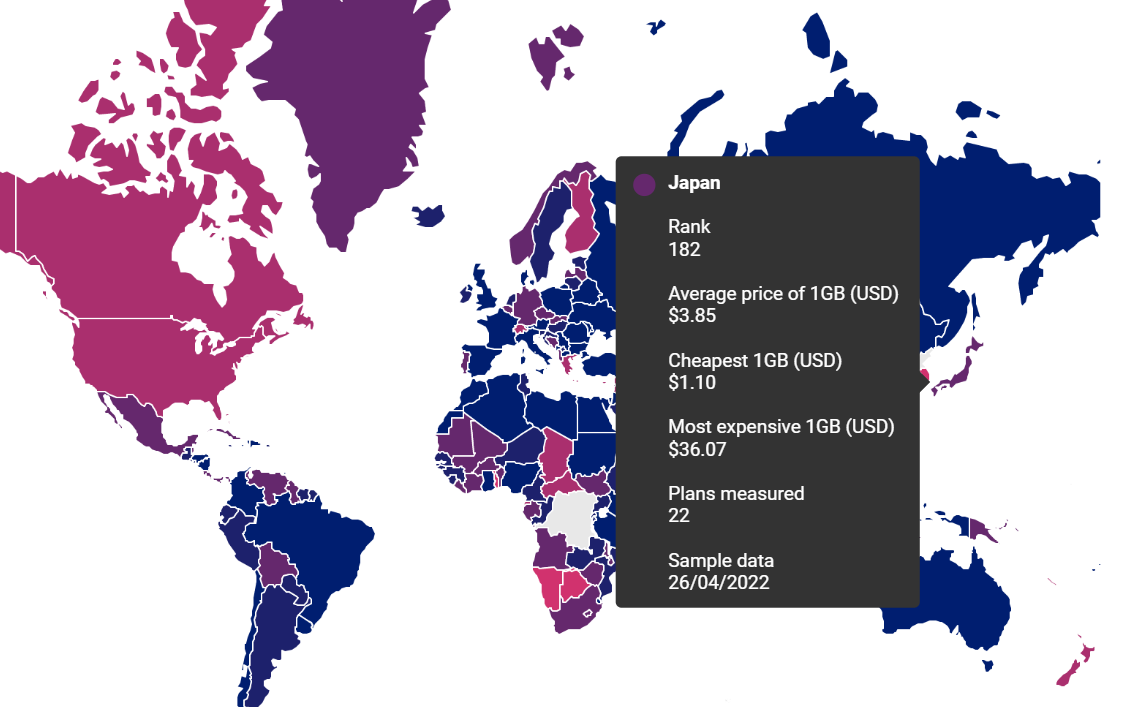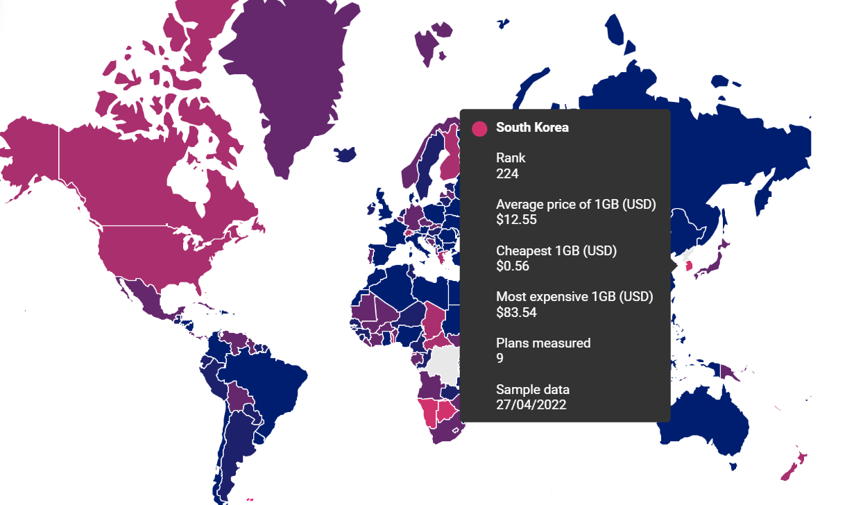 국가에 커서를 놓으면 정보가 표시됩니다. 한국은 233개국 중 224위로(왜 이렇게 비싸...), 데이터 통신량 1GB당 평균 가격은 12.55달러(약 16,000원)입니다. 샘플 데이터는 2022년 4월 27일의 시점입니다.