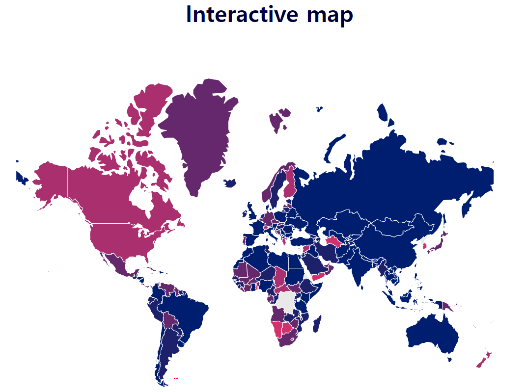 Worldwide Mobile Data Pricing 2022로 이동하면 세계 지도가 나타납니다. 데이터 통신량 GB당 평균 가격에 따라 233개국이 색으로 구분되어 있습니다. 최저가에 가까울수록 파랑색, 최고가에 가까울수록 붉은색 입니다.