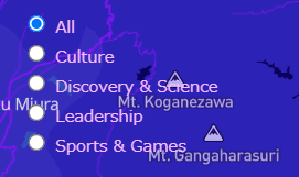 화면 좌단 중앙에 있는 「All(모두)」「Culture(문화)」「Discovery & Science(발견・과학)」「Leadership(지도자)」「Sports & Games(스포츠・게임)」를 클릭하여 카테고리별로 지역의 유명 인사를 볼 수 있습니다.