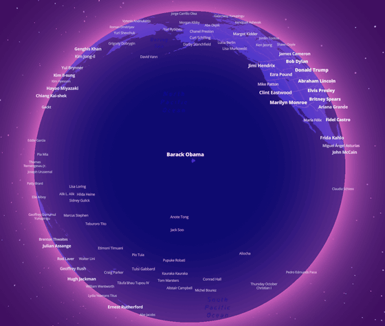 「Notable people」에서는 확대하면서 점차 많은 이름이 나타나게 됩니다만, 확대 전의 단계에서 보이는 이름은 그 지역 출신의 가장 유명한 사람입니다. 아래처럼 태평양 한 복판에 "Barack Obama (버락 오바마)"의 이름이 표시되는 것은, "하와이 출신으로 가장 유명한 사람은 버락 오바마"라는 것입니다.