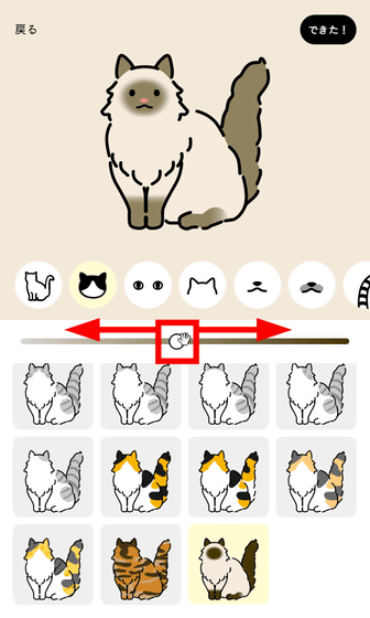 상부에 작성 중인 고양이의 일러스트가 나오고, 가운데에는 고양이 일러스트의 어느 부위를 변경할지, 하단부에는 선택한 부위 중에서 변경할 수 있는 파트의 선택사항이 줄지어서 나옵니다.