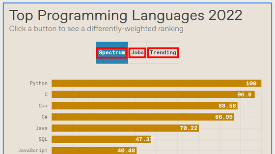 프로그래밍 언어의 인기 순위는 다음과 같습니다. 페이지에 액세스 한 시점에서는 IEEE 회원의 취향에 중점을 둔 랭킹(Spectrum)이 표시되고 있습니다만, 「Jobs(구인 정보)」 또는 「Trending(포럼이나 소셜 미디어의 트렌드)」를 클릭하여 각각 순위를 전환할 수 있습니다.