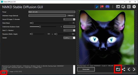 기본 설정은 하나의 프롬프트에 대해 5개의 이미지를 생성합니다. 이미지 생성이 완료되면 왼쪽 하단의 로그에 "Done!"이 표시되고 오른쪽 열에 생성된 이미지가 표시됩니다. 오른쪽 하단의 폴더 아이콘을 클릭하면 출력된 이미지가 저장된 폴더가 표시됩니다.