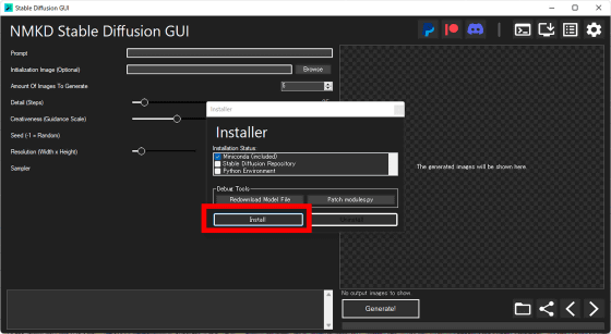 NMKD Stable Diffusion GUI는 처음부터 Anaconda를 기반으로 한 배포판이 내장되어 있으며, 나머지는 Stable Diffusion의 리포지토리와 Python, PyTorch, Cuda ToolKit의 다운로드가 필요한 상태입니다. Install을 누르십시오.