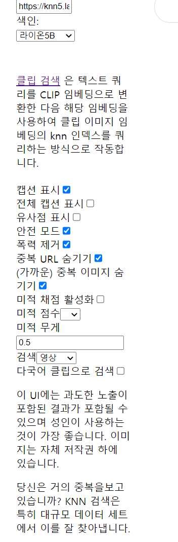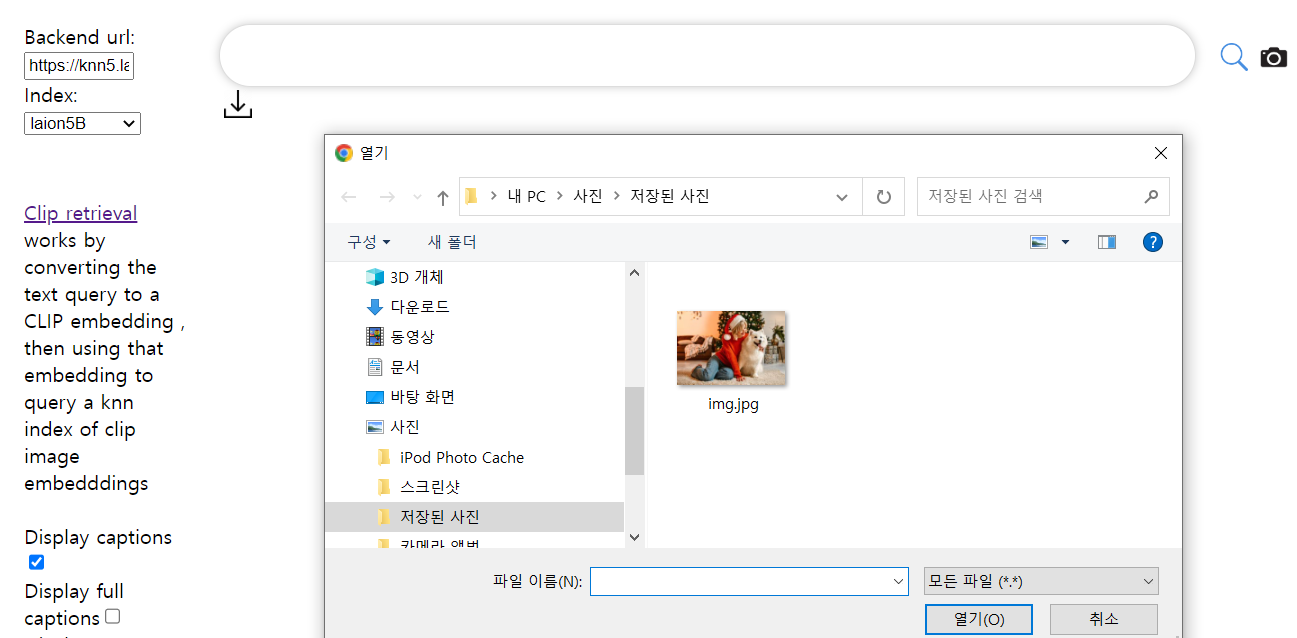 clip-retrieval은 이미지를 입력하면 그와 비슷한 이미지를 영문명과 함께 표시해주는 시스템으로, Stable Diffusion에서 생성할 이미지의 참고 이미지를 입력하여 이미지 생성용 영문장의 팁을 얻을 수 있습니다.