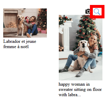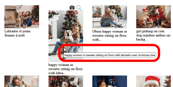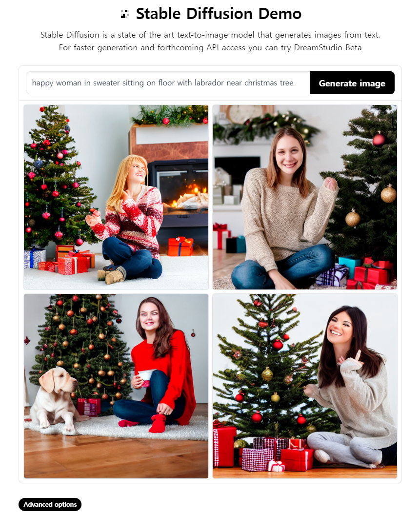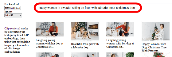 영문장이 상단 검색창에 입력되고, 그 영문장에 따른 이미지가 다시 검색됩니다. 이번에는 "happy woman in sweater sitting on floor with labrador near christmas tree(크리스마스트리 근처에서 래브라도와 함께 바닥에 앉아 스웨터 차림을 한 행복한 여자)"라는 문장이 표시되었습니다. 검색창에 표시된 영문을 복사하면 Stable Diffusion에서 이미지 생성에 활용할 수 있습니다.