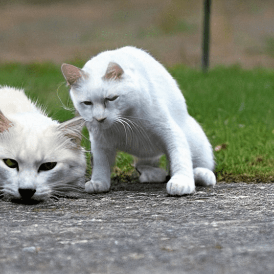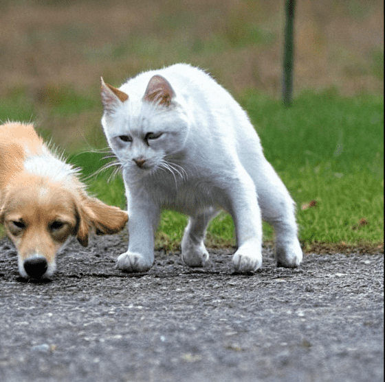 그 후에 흰 고양이를 응시하는 개가 등장.