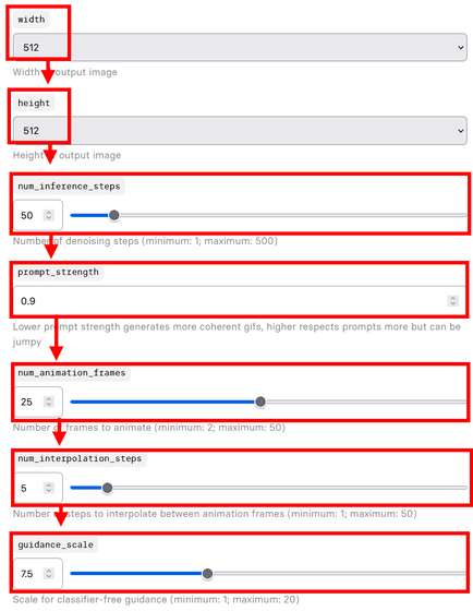 다음으로는 생성할 GIF 애니메이션의 폭과, 높이를 선택. 노이즈 제거 스텝, 일관성을 정하는 프롬프트 강도, 애니메이션의 프레임수, 프레임간의 보간 스텝수, 분류자 없는 가이던스의 척도를 설정합니다.