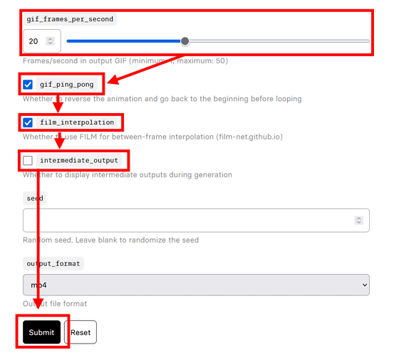 FPS, 애니메이션의 끝에서 다시 시작 프롬프트로 향하게 할 것인지, 프레임간의 보간에 FILM을 사용할지, 생성 시에 중간층의 출력을 표시할지를 결정하고 「Submit」을 클릭하면 생성이 시작됩니다.