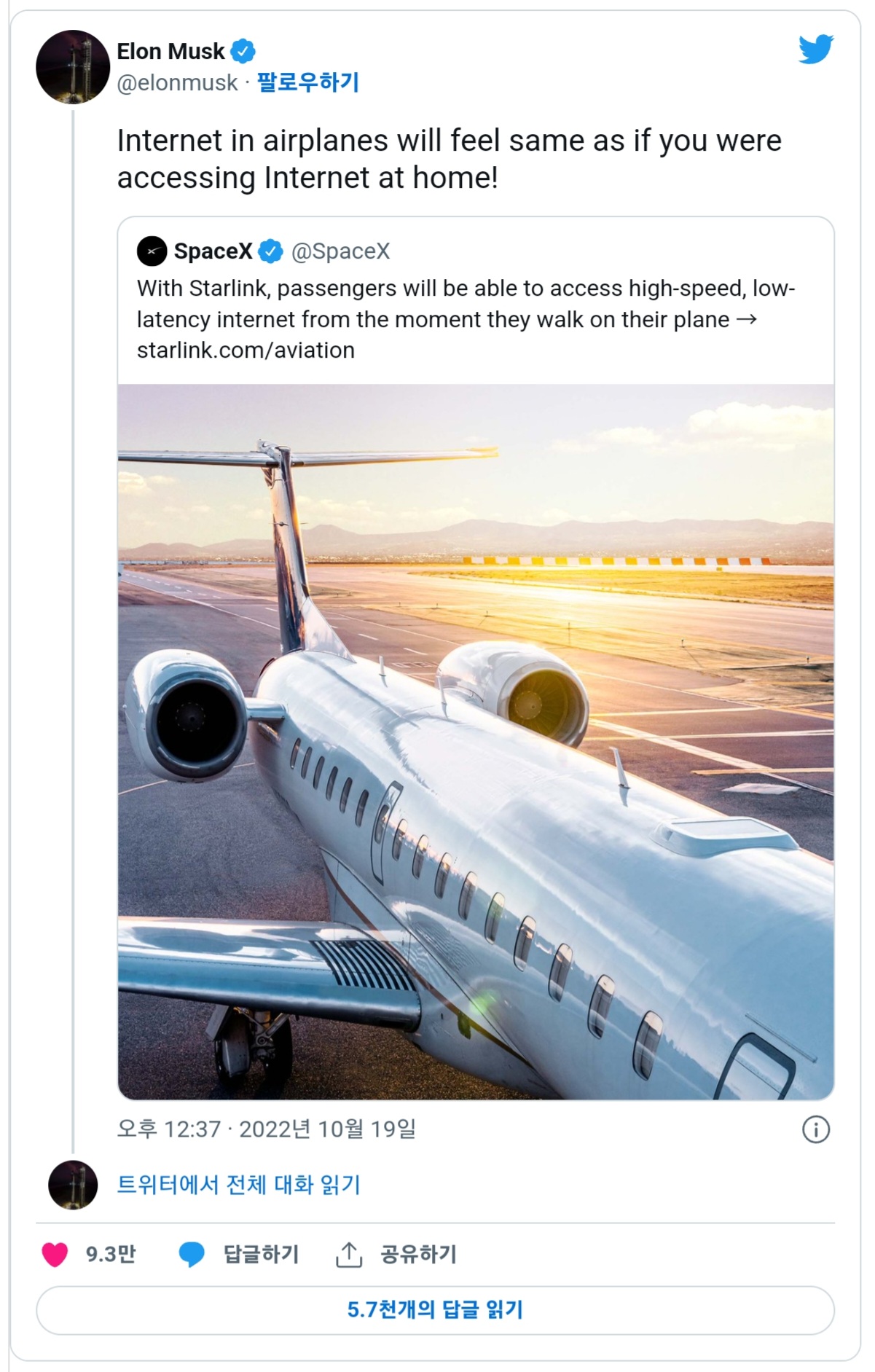 Starlink를 전개하는 우주 기업 SpaceX의 일론 머스크 CEO는 “기내에서의 인터넷 접속이 마치 집에서 사용하는 것 같을 것이라고” 호언하고 있습니다.