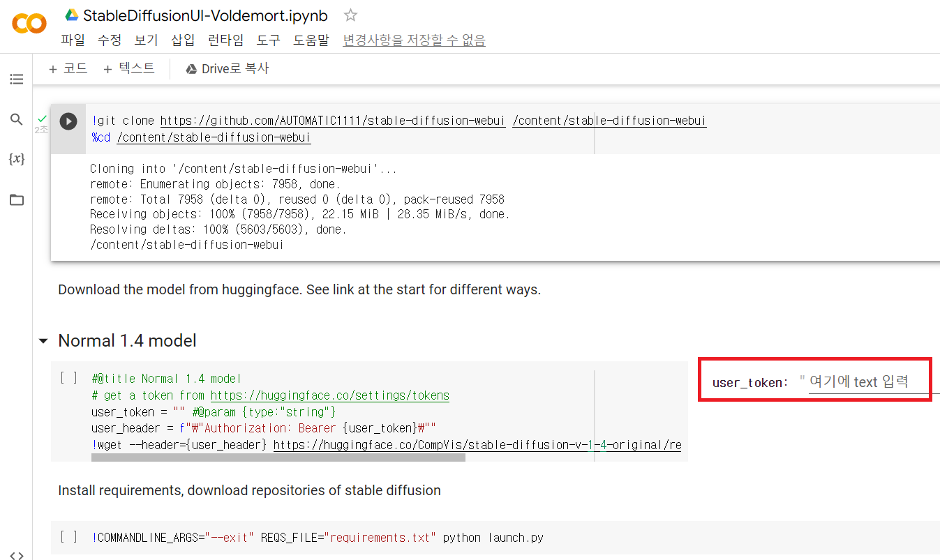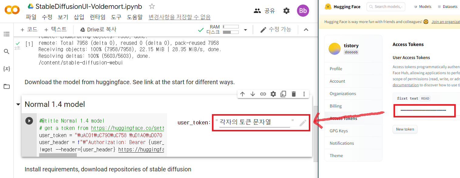 여기서 작업이 필요한 것은, 오른쪽에 "여기에 text 입력"이라는 입력란이 나타납니다. 여기에는 AI 관련 커뮤니티 사이트 "Hugging Face"의 토큰을 입력해야 합니다.