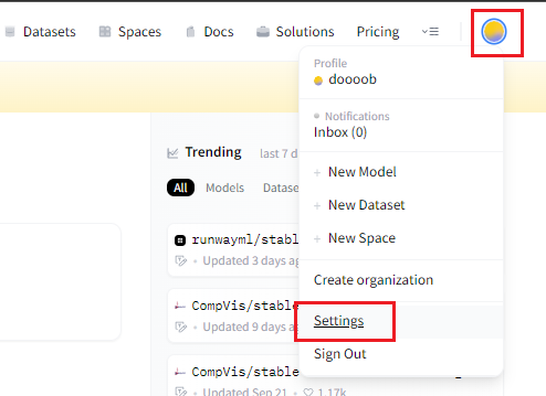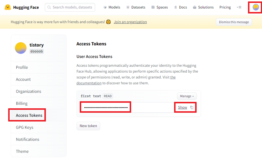 이미 Hugging Face 계정과 토큰이 있으시다면, 아래 위치에서 토큰 번호를 확인하실 수 있습니다.