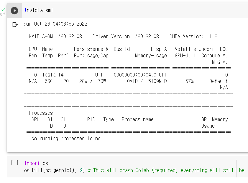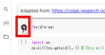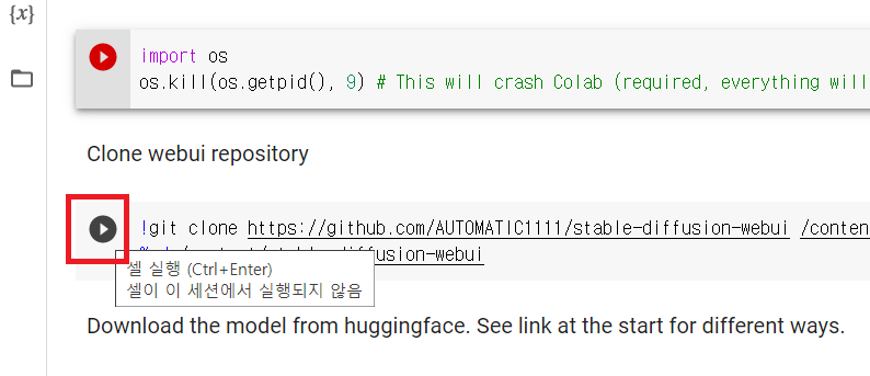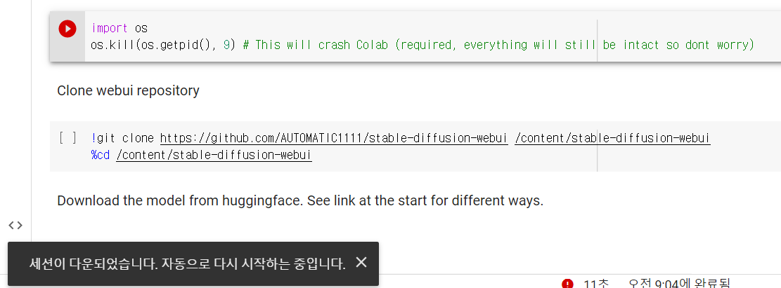 「import os」라고 하는 코드 부분에서는 재생 버튼을 누르면 브라우저 하단에 메시지가 표시되면서 재생 버튼이 빨갛게 변합니다. 완료 표시도 나오지 않지만, 그냥 무시하시고 다음으로 진행해도 됩니다.