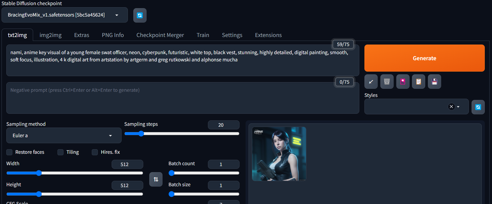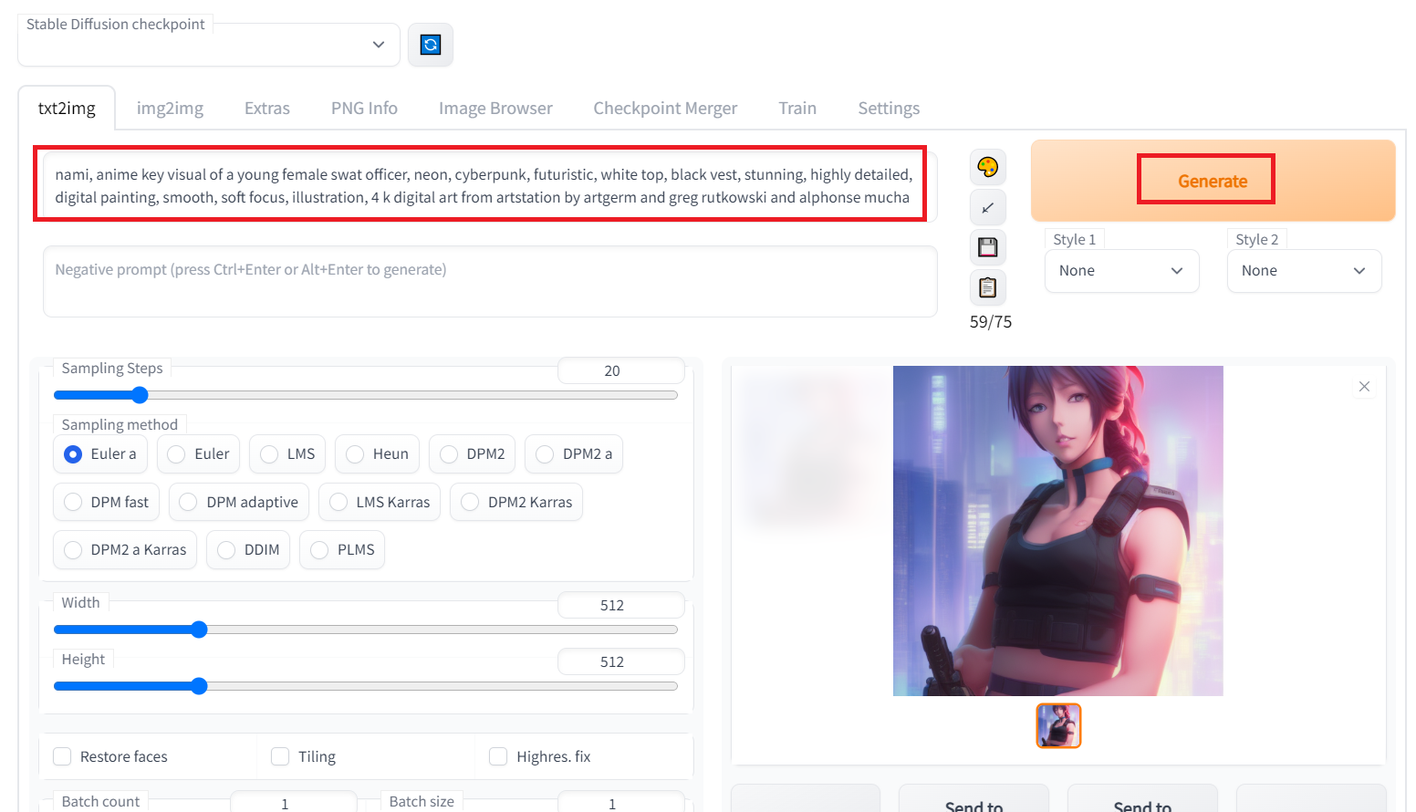 제가 따온 프롬프트는 [nami, anime key visual of a young female swat officer, neon, cyberpunk, futuristic, white top, black vest, stunning, highly detailed, digital painting, smooth, soft focus, illustration, 4 k digital art from artstation by artgerm and greg rutkowski and alphonse mucha]입니다.