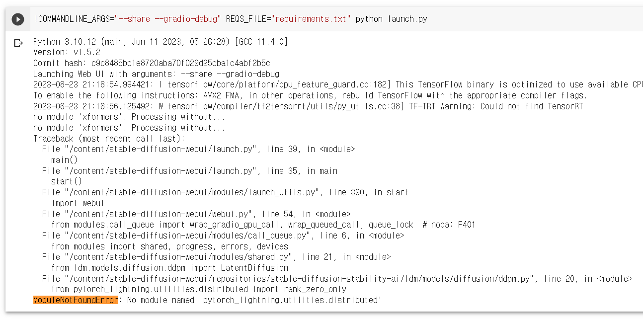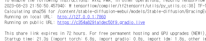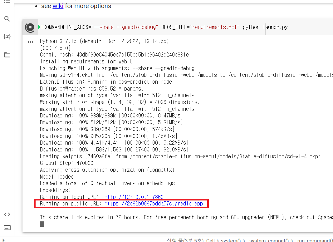 마지막으로 아래처럼 Running on public URL 이 나오면 완료입니다.