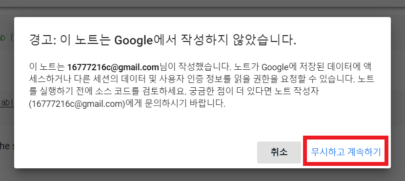 첫 번째 실행 버튼을 누르면 이와 같은 메시지가 나오지만, "무시하고 계속하기"를 클릭합니다.