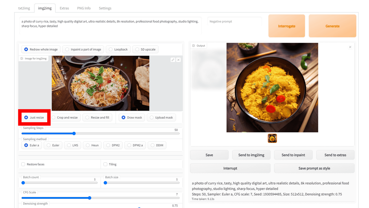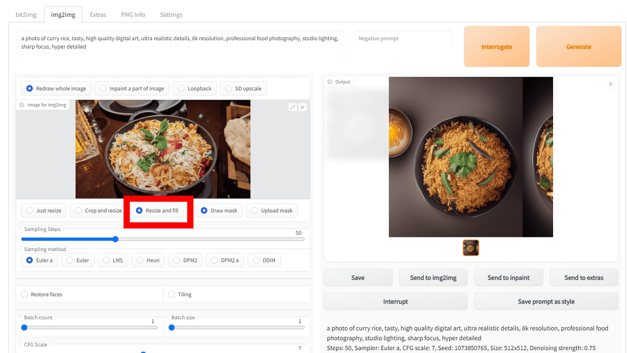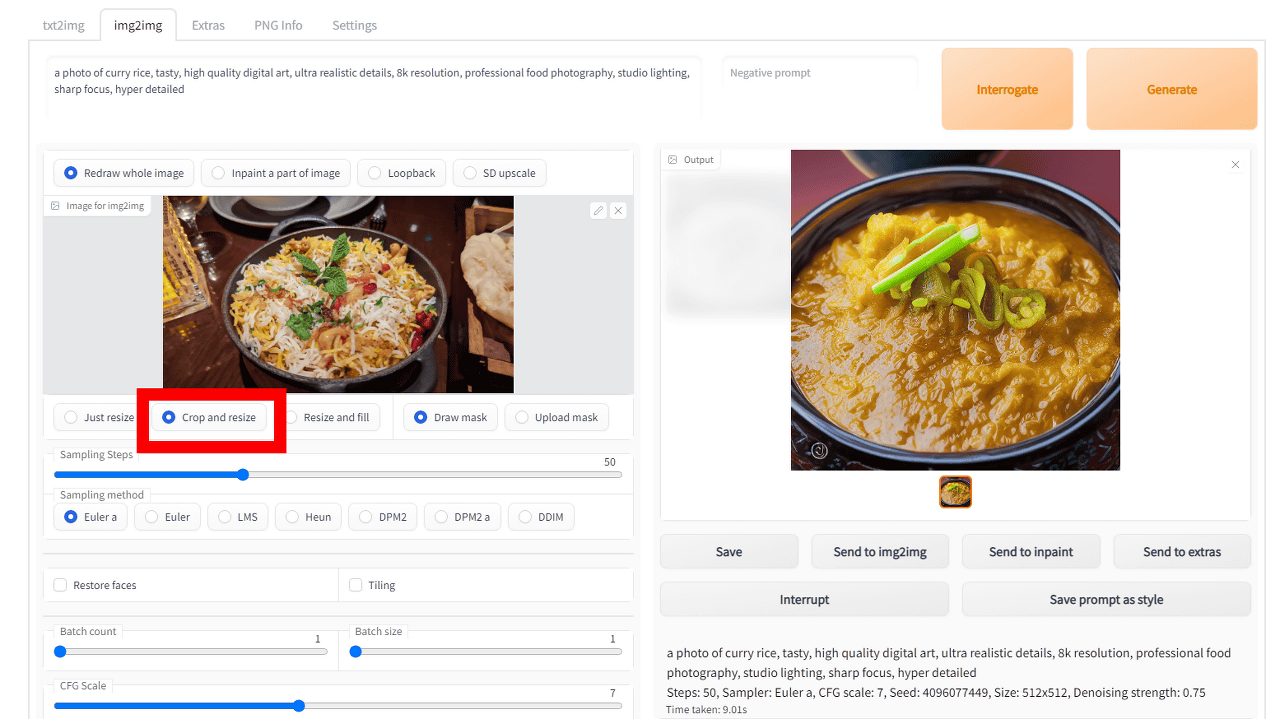 「Crop and resize」는 입력 화상의 종횡비를 유지한 채로 화상을 생성해, 출력 화상의 종횡비에 맞추어 자동으로 잘라내는 모드. 예를 들어, 아래의 입력 이미지에서는 요리의 좌우에 여백이 있지만, 생성된 출력 이미지는 좌우가 컷 되어 화면 가득 요리가 찍혀 있습니다.