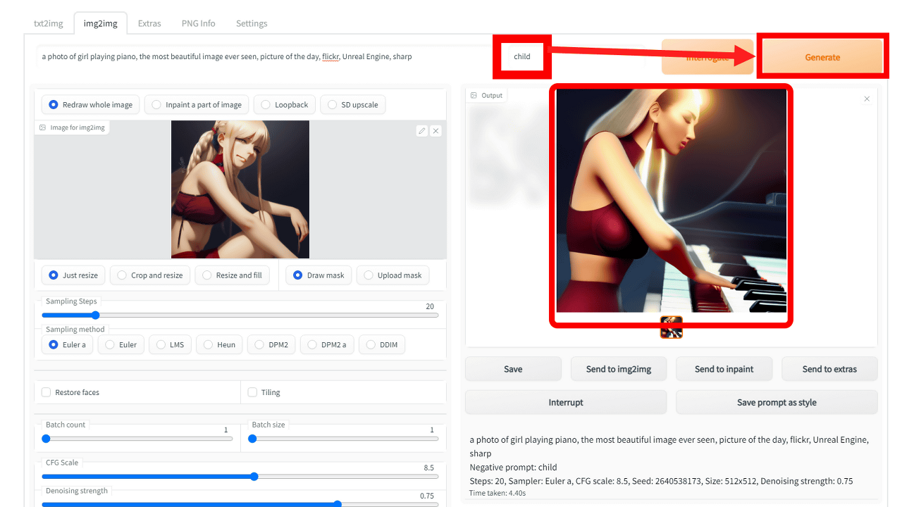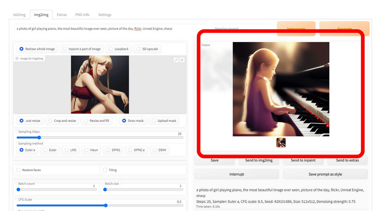 그리고 프롬프트에 문장을 입력하고 "Generate"를 클릭하면 가져온 이미지를 기반으로 새로운 이미지를 Stable Diffusion이 생성합니다. 이번에는 「a photo of girl playing piano, the most beautiful image ever seen, picture of the day, Unreal Engine, sharp」를 입력했습니다.
