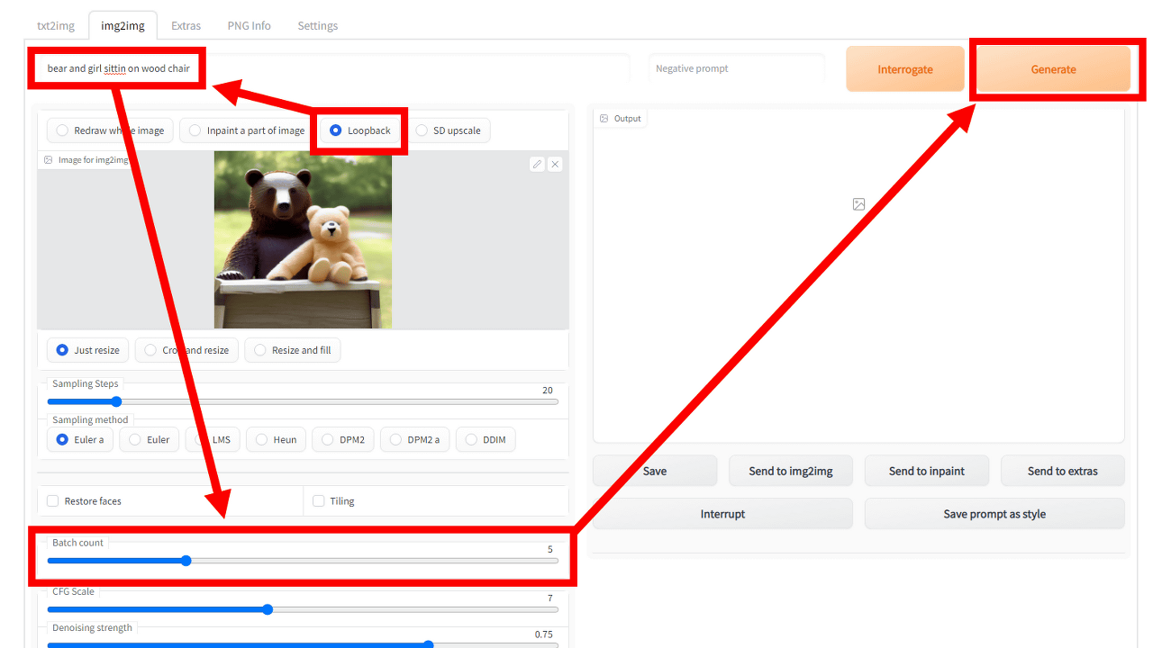Loopback은 'img2img' 상단의 'Loopback'을 체크할 수 있습니다. 이미지와 프롬프트를 입력한 후 Batch size에서 루프 횟수를 결정하고 Generate를 클릭합니다.