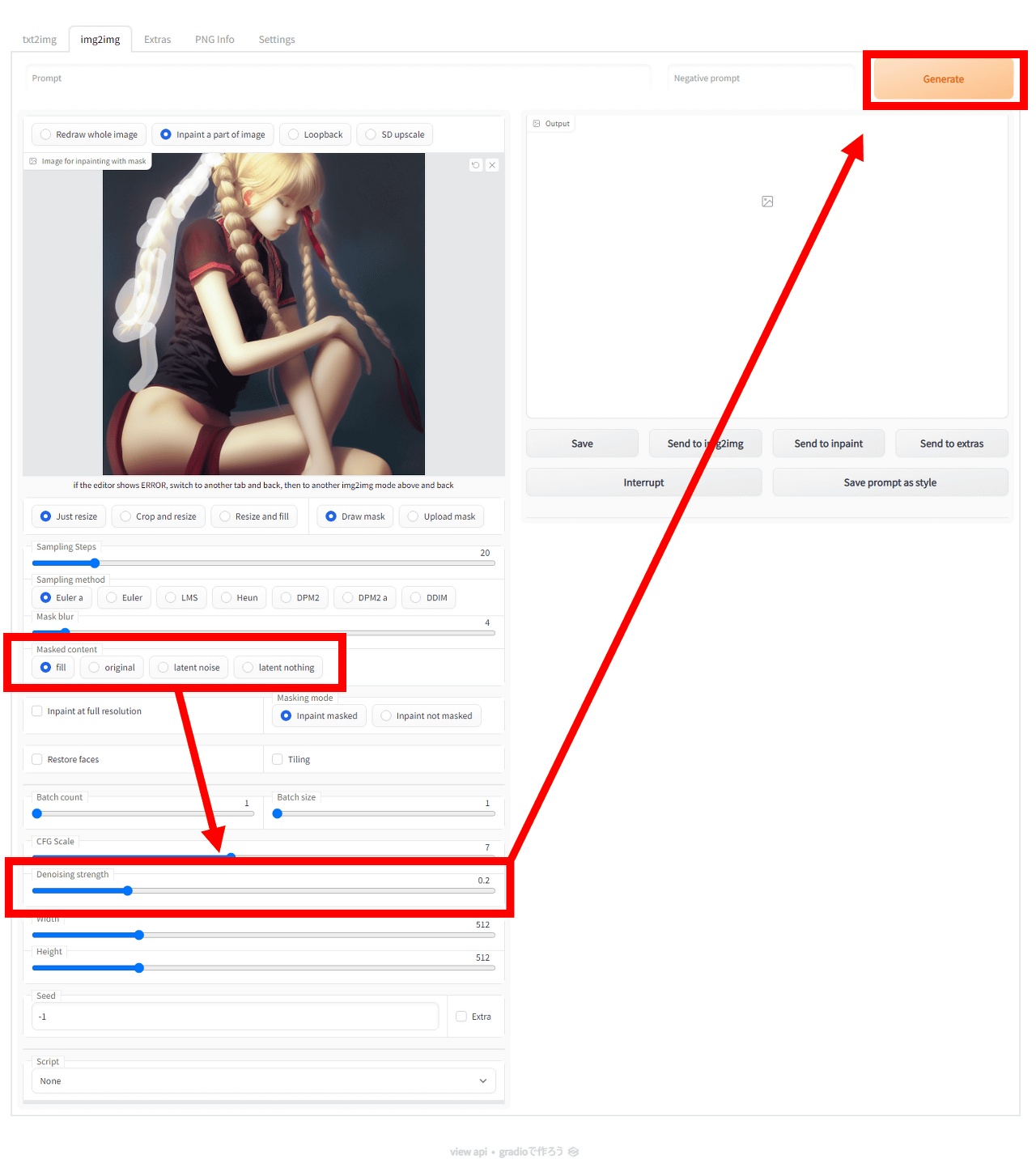 Inpainting의 처리는 「full」,「original」,「latent noize」,「latent original」의 4종류가 준비되어 있습니다. 처리 방법을 선택하고 Denoising strength를 조정하고 Generate를 클릭합니다. Denoising strength는 Stable Diffusion의 기계 학습 알고리즘에 있어서의 노이즈 제거의 강도를 나타내는 것으로, 어느 정도의 조정이 필요합니다. 이번에는 Denoising strength를 0.2로 설정했습니다.