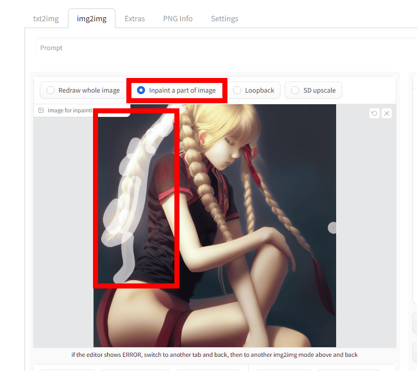 Inpainting 기능을 사용하려면 이미지를 로드한 후 Inpaint a part of image를 선택합니다.