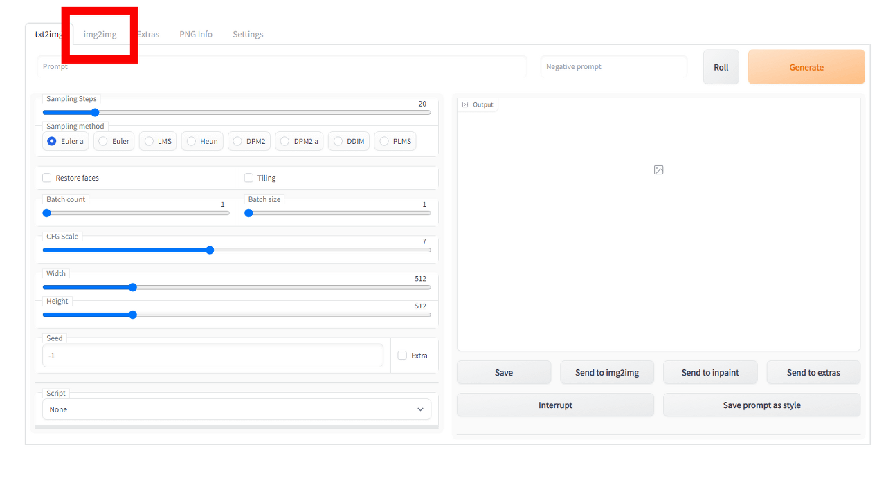 img2img를 사용하려면 상단의 "img2img" 탭을 클릭합니다.