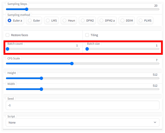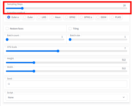 「Sampling Steps」는, 화상 생성에 있어서의 피드백 공정을 몇 회 실시하는가 하는 것. 수를 늘리면 늘릴수록 정교한 그림이 되어 갑니다만, 당연히 늘릴수록 시간이 오래 걸리게 됩니다. 또, 수를 늘린다고 꼭 좋은 그림이 되는 것은 아니라는 점도 어려운 부분입니다. 초기 설정 그대로 20을 입력해도 적당히 완성됩니다만, 늘리고 싶다면 110 정도까지입니다.