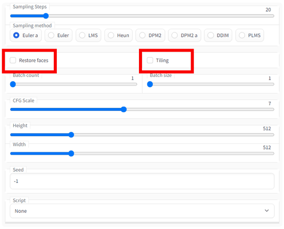 "Restore faces"와 "Tiling"은 이 AUTOMATIC 1111 버전의 특징 중 하나입니다. 「Restore faces」는 Generative Facial Prior GAN(GFPGAN)을 이용해 무너지기 쉬운 얼굴의 보정을 강력하게 실시해, 가능한 한 좌우 대칭을 유지해 줍니다. Tiling(타일링)은 생성된 이미지를 타일처럼 정렬합니다.