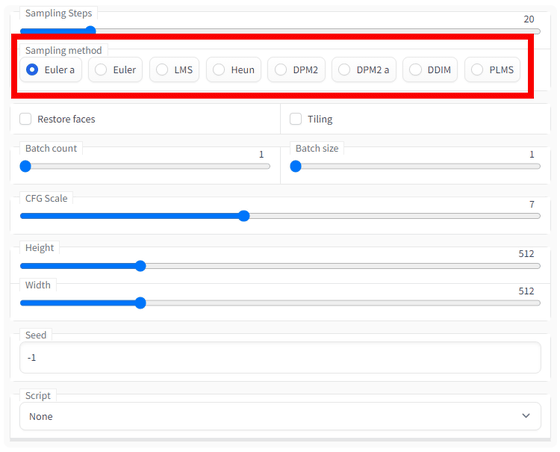 「Sampling method」는, 피드백 공정에 있어서 어떠한 알고리즘을 채용하는지를 선택할 수 있습니다. 기본적으로는 「Euler a」로 OK.
